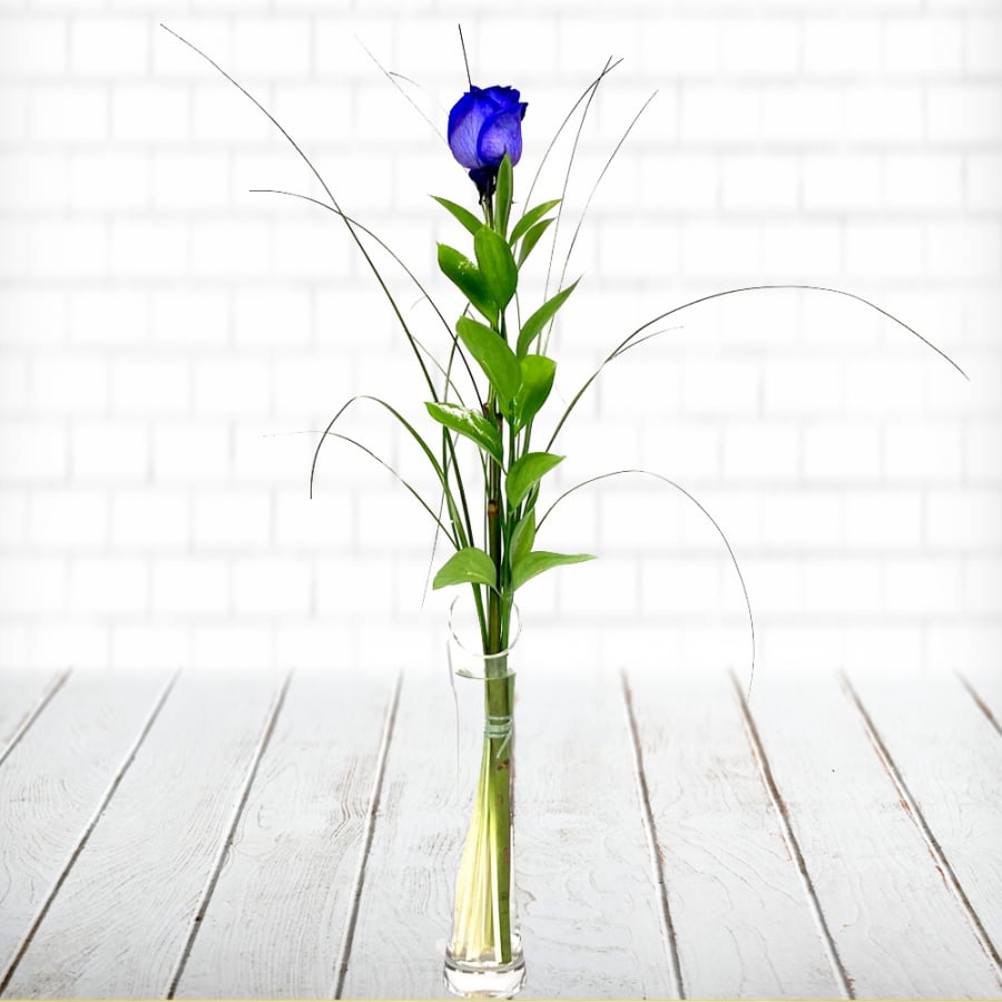 Möchten Sie gerne eine einzelne langstielige mit Ruskus bzw. Salal sowie feinen Gräsern dezent dekorierte blaue Rose verschenken, dann liegen Sie mit diesem Blumengruß genau richtig. Diese einzelne Rose sagt mehr als tausend Worte. Die Farbe ist ein schönes kräftiges Königsblau. Allerdings ist die Rose nicht von Natur aus so blau, sie wurde in einem speziellen Verfahren mit einem Farbstoff gefärbt.