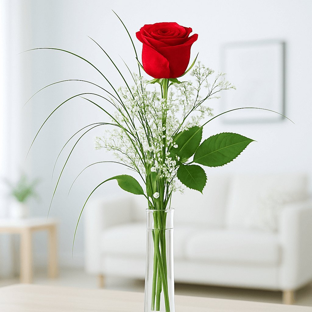Große rote Rose mit Schleierkraut, Gräsern und gratis Vase