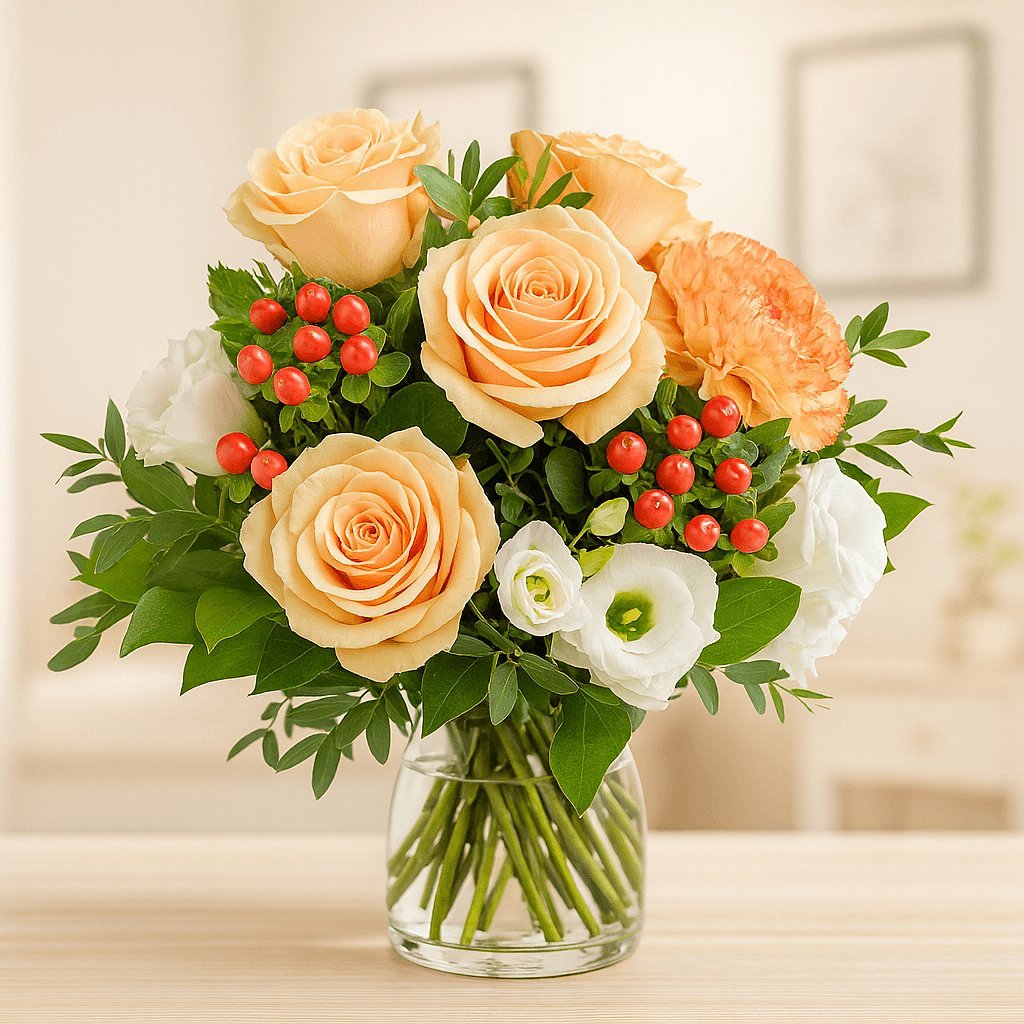 Sie sind auf der Suche nach einem cremefarbenen Blumenstrauß, bzw. einem Strauß in Cremetönen? Dann ist dieser edle Strauß mit großblütigen cremefarbenen Rosen genau das Richtige für Sie. Ein eleganter Strauß, der das Herz der Empfängerin bzw. des Empfängers ganz bestimmt höherschlagen lässt. Die Rosen und Nelken werden mit frischem roten Hypericum sowie weißem Lisianthus und frischem Grün liebevoll aufgebunden.