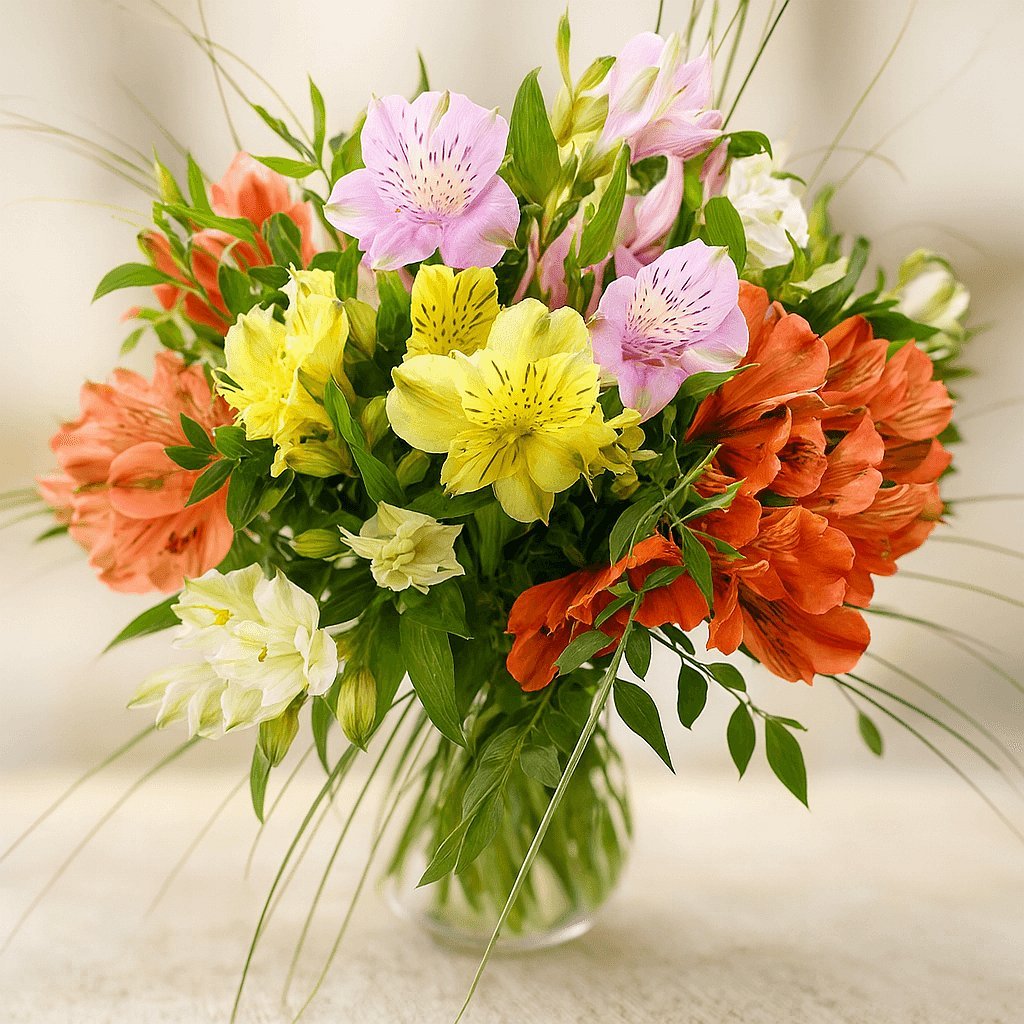 Der bunte Alstromerien Blumenstrauß mit 15 bunten verzweigten Alstromerien ist ein wahrer Hingucker, ein Feuerwerk der Farben! Er eignet sich besonders zum Geburtstag, als Überraschung, für die Freundschaft oder zum Beispiel als Danksagung. Alstromerien (Inkalilien) sind wunderschöne Blumen, die sich erst mit der Zeit öffnen und so nach und nach ihre ganze Pracht zeigen.