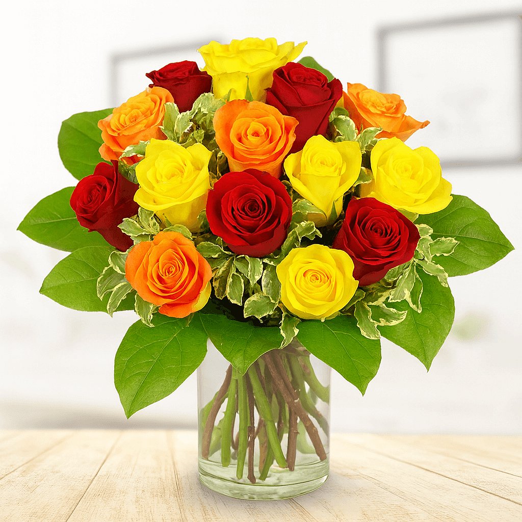 12 Rosen, fünf rote, fünf gelbe und fünf orangefarbene Rosen (gelb-rot), kunstvoll aufgebunden mit frischem Schnittgrün.