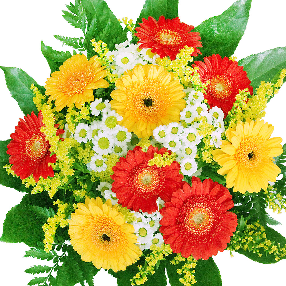 Diesen handgebundenen Sommer Blumenstrauß schmücken farbenfrohe Gerbera in den Farben Rot und Orange, gelbe Solidagozweige sowie weiße Chrysanthemen, die mit diversem Schnittgrün der Saison sowie großen Aralienblättern einen farbintensiven, sommerlichen Blumenstrauß bilden.