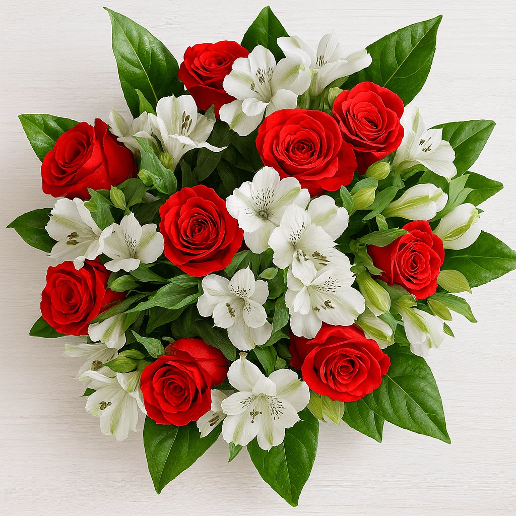 Überraschen Sie Ihre(n) Liebste(n) mit diesem liebevoll handgebundenen Blumenstrauß mit roten Rosen und weißen Alstromerien. Verwendet werden rote Rosen und verzweigte weiße Alstromerien (Inkalilien), eine liebevolle, herzliche Geschenkidee, die zu vielen verschiedenen Anlässen passt.