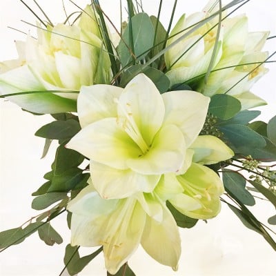 Zum Angebot "Blumenstrauß - Drei weiße Amaryllis mit Eukalyptus und Gräsern" gehören: