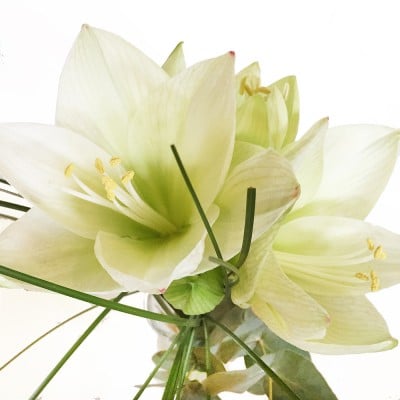 Zum Angebot "Weiße Amaryllis mit Eukalyptus und Gräsern" gehören: