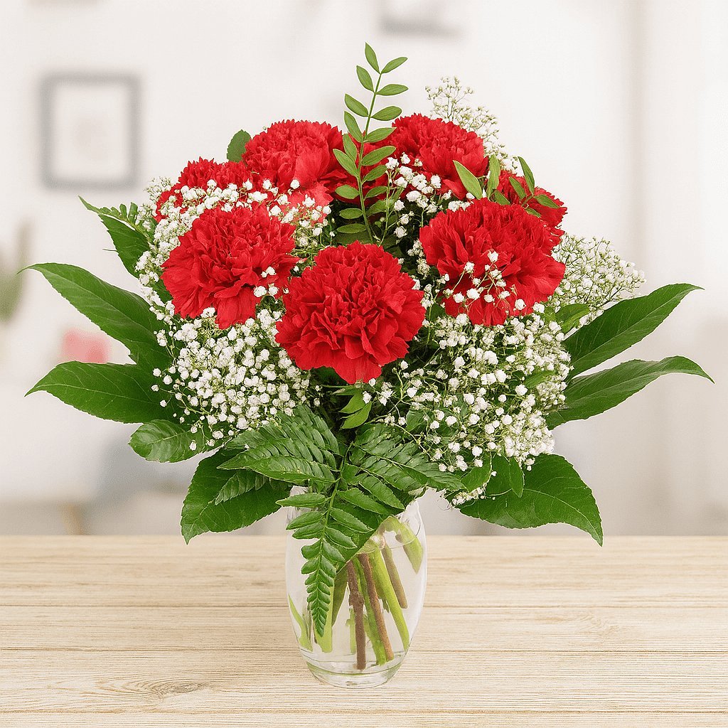 Wer diesen herrlichen Blumenstrauß mit roten Nelken und weißem Schleierkraut in den Händen hält wird ganz bestimmt begeistert sein! Sorgen Sie mit diesem herrlichen Strauß für eine perfekte Überraschung. Der locker gebundene Strauß besteht aus roten Nelken, weißem Schleierkraut sowie diversem Schnittgrün der Saison.