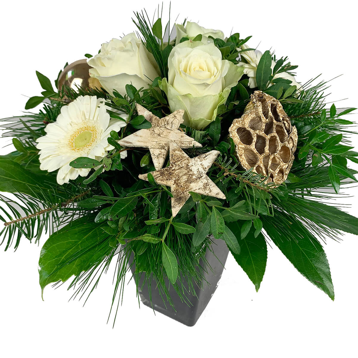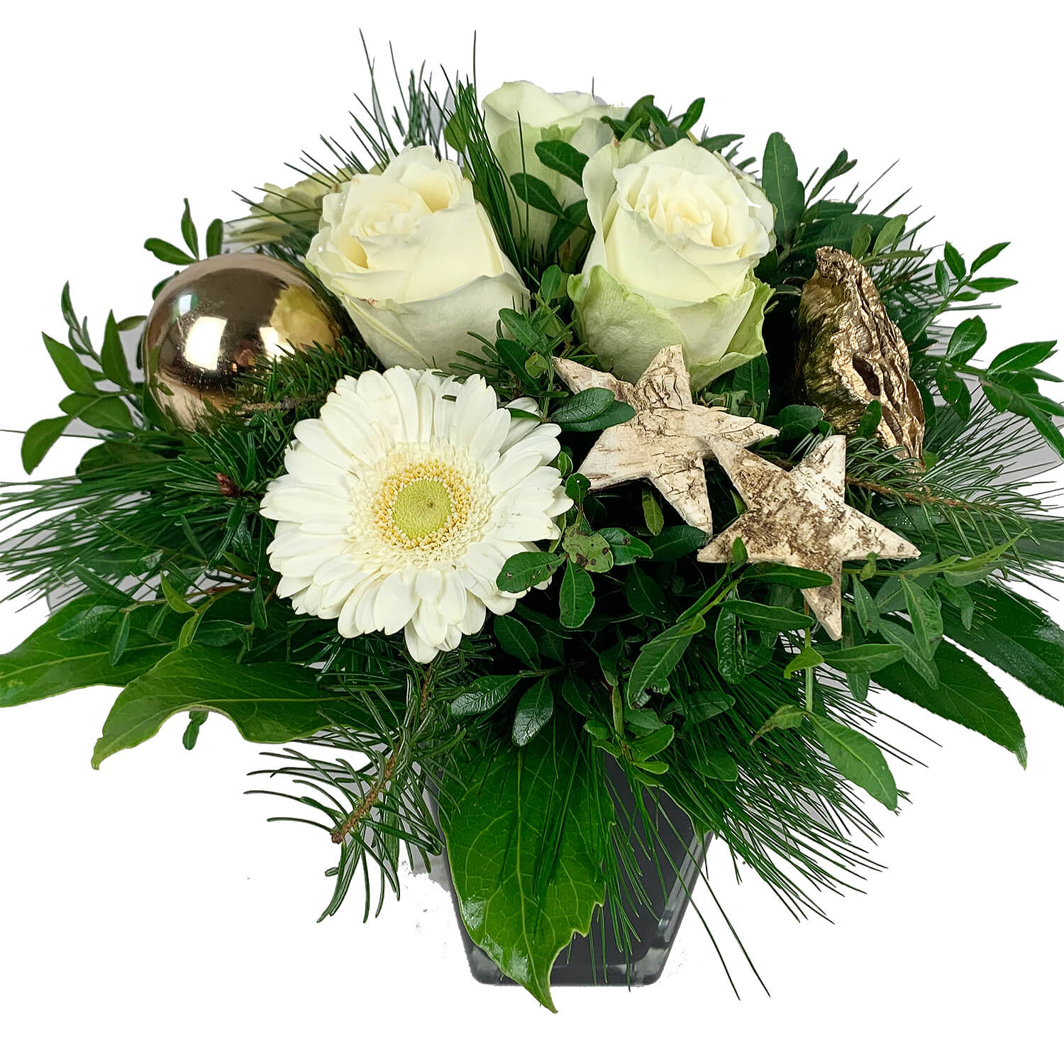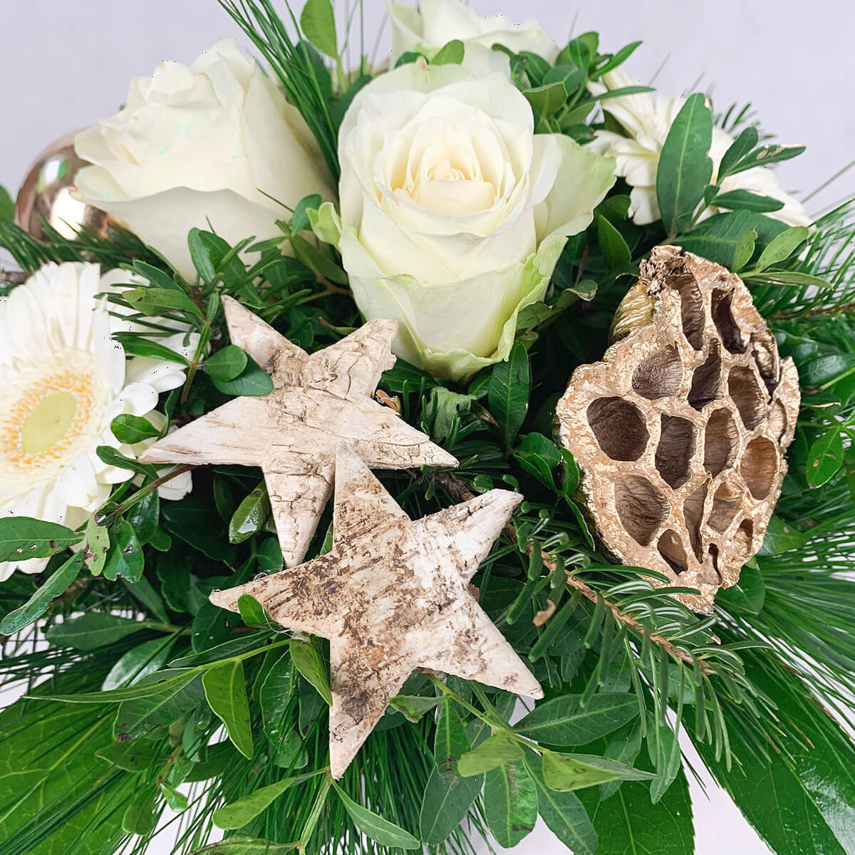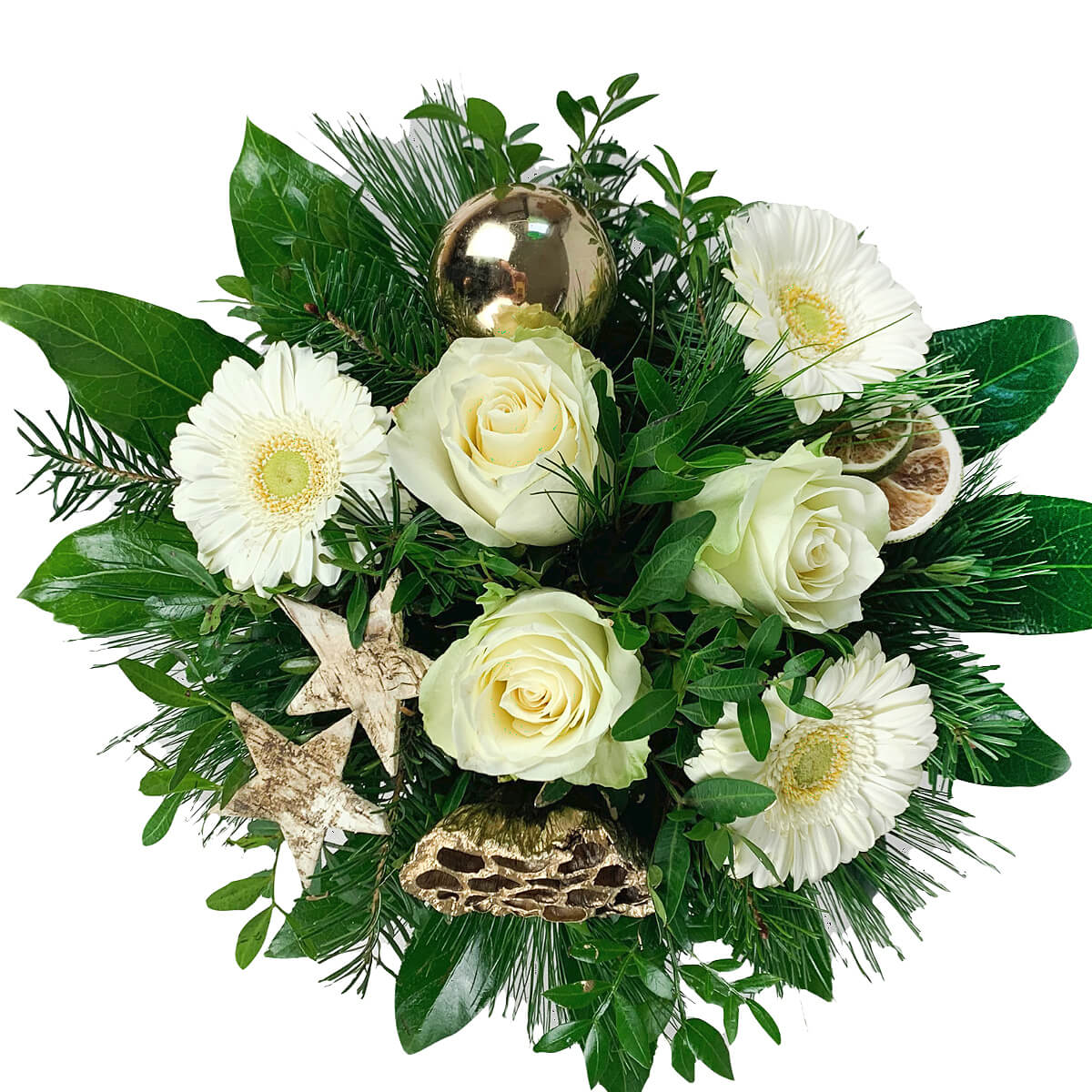 Zum Angebot "Blumenstrauß Weihnachten - Weiße Rosen und weiße Gerbera" gehören:
